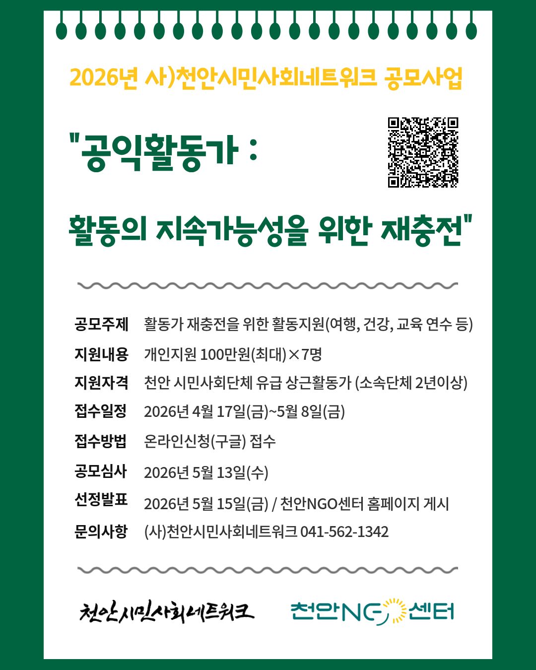 7. 선정발표 : 5월 15일(금) / 천안NGO센터 홈페이지 게시